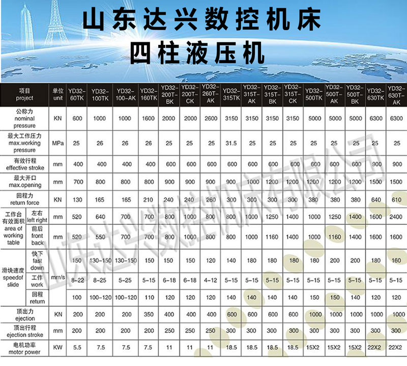 山东达兴数控机床有限公司可根据客户加工工艺需求不同,可以设计定制100吨-1000吨液压机,四柱式、